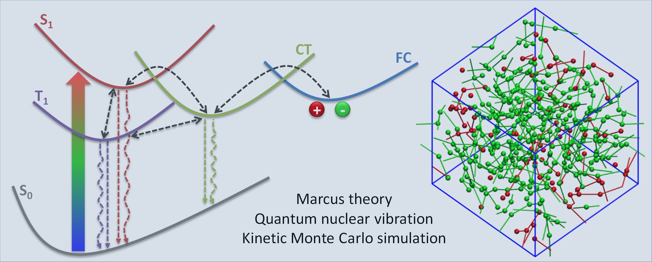本课题组研究内容之三是发展多尺度的计算方法,基于聚集态结构和微观分子电子性质,模拟电荷和激发态的动力学过程,揭示有机光电的内在机理,阐明分子结构与有机光电性能之间的关系。