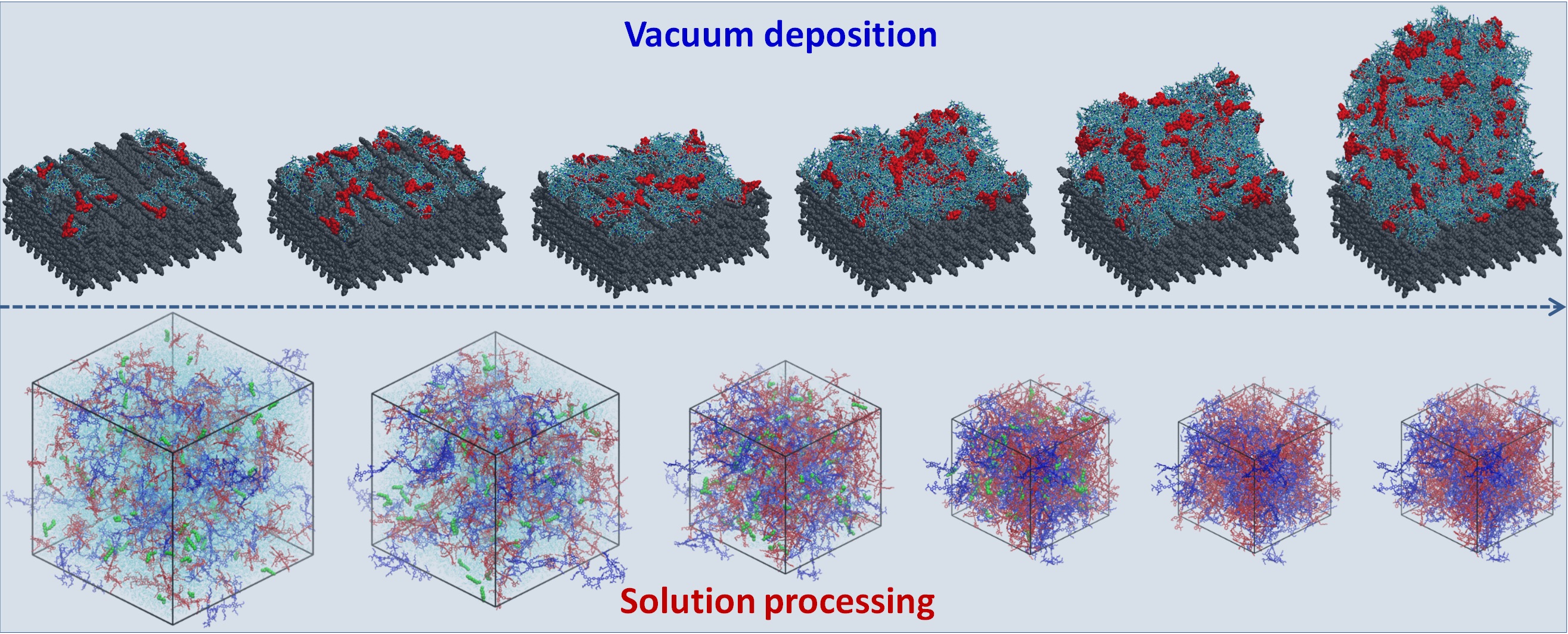 分子聚集态结构为电荷和激发态提供周围环境和运动网络,对有机光电性能产生重要影响。本课题组研究内容之二是发展可靠的分子动力学方法,仿真模拟揭示分子自组装过程和聚集态结构。